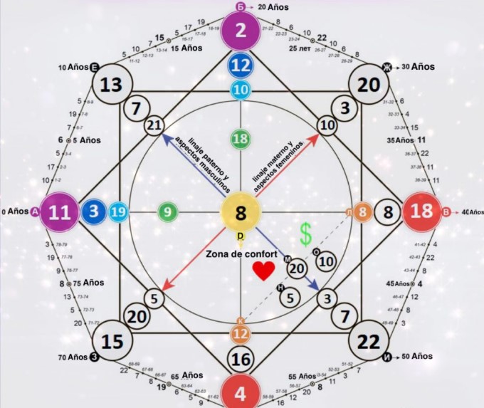 Es un hexagrama compuesto por 22 números arquetípicos que representan etapas, tensiones y aprendizajes vitales. Cada número se activa en edades específicas (0, 5, 10, 15, etc.) y cada línea de conexión entre ellos muestra una tensión evolutiva que puede volverse integración consciente.